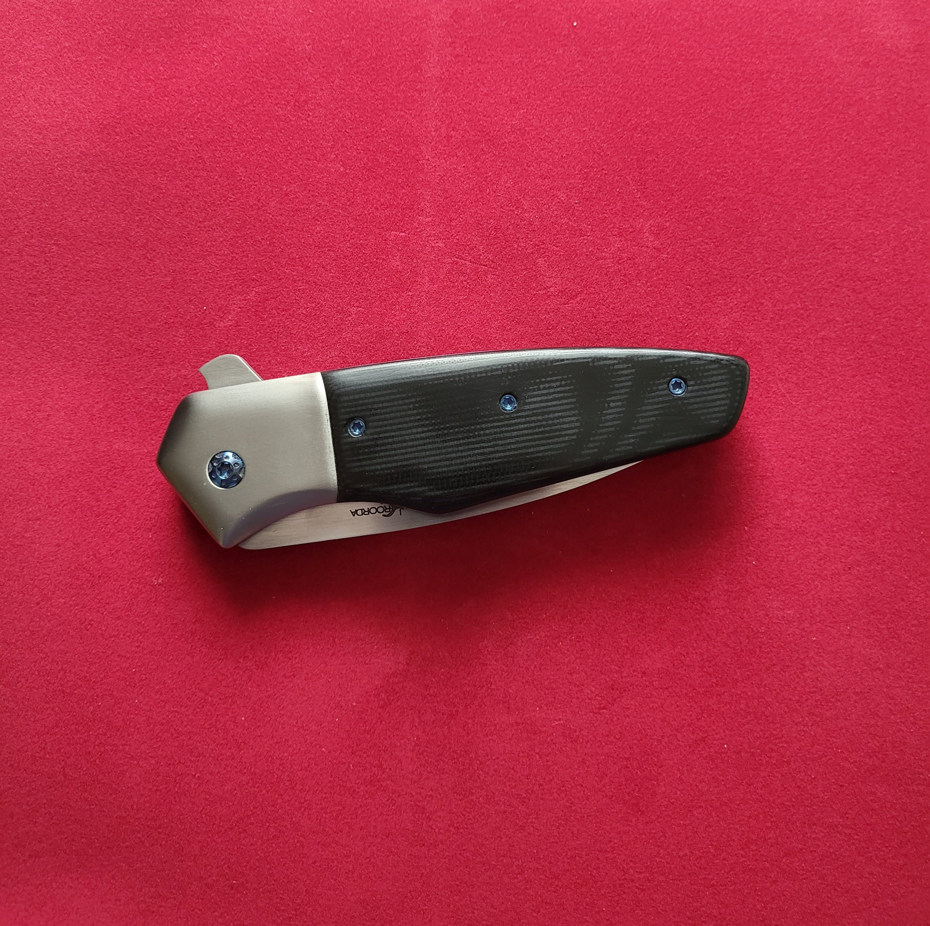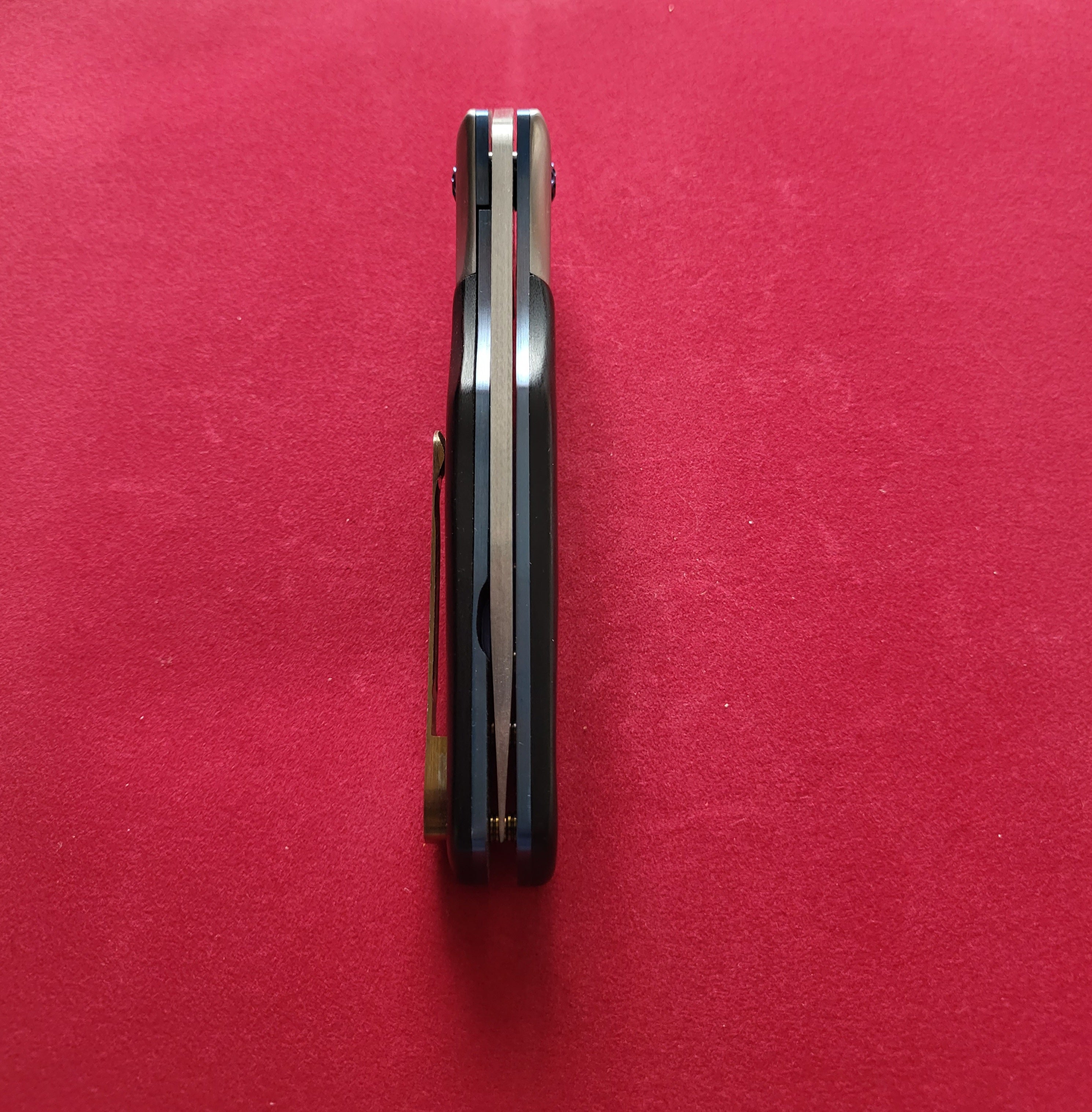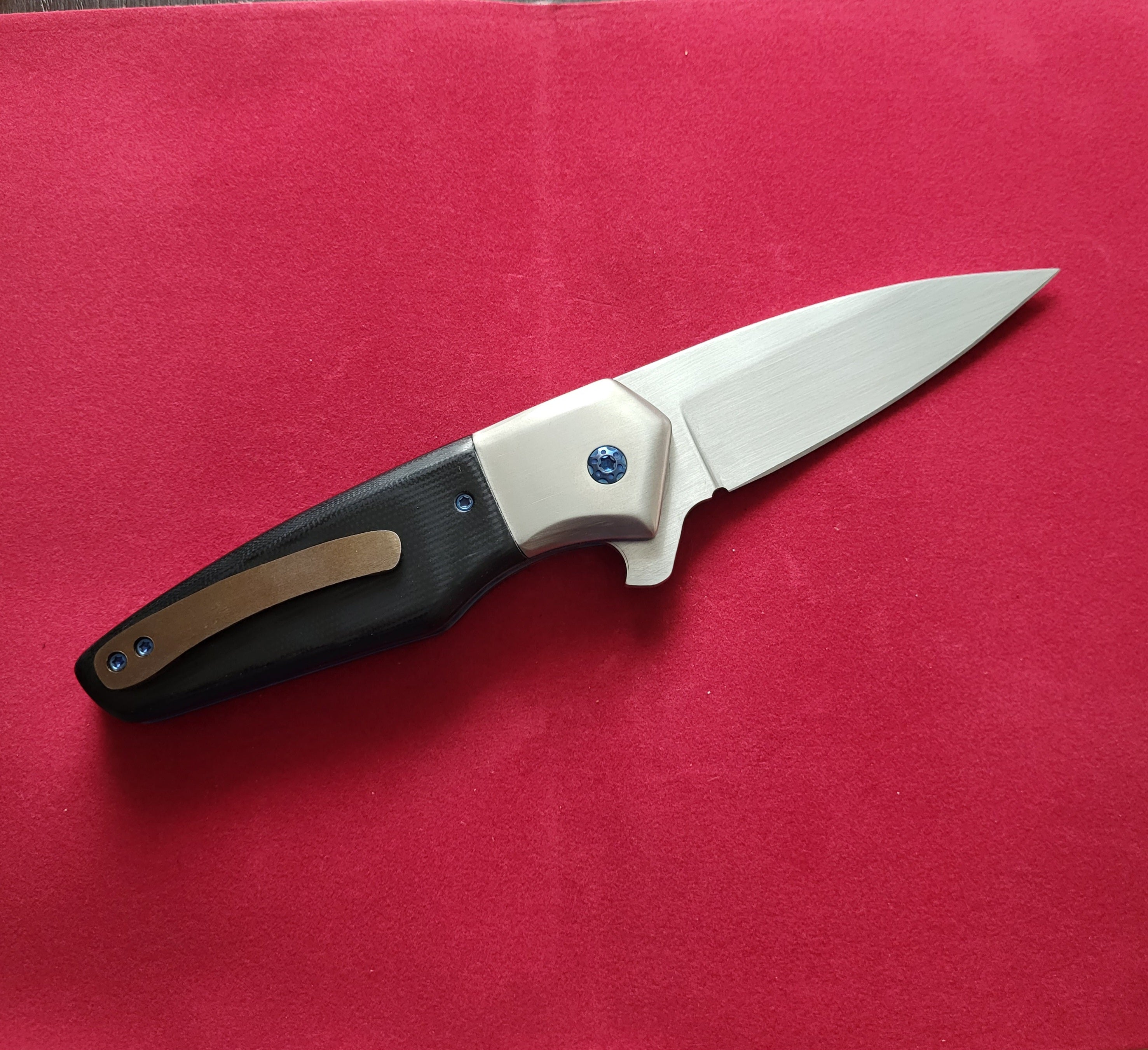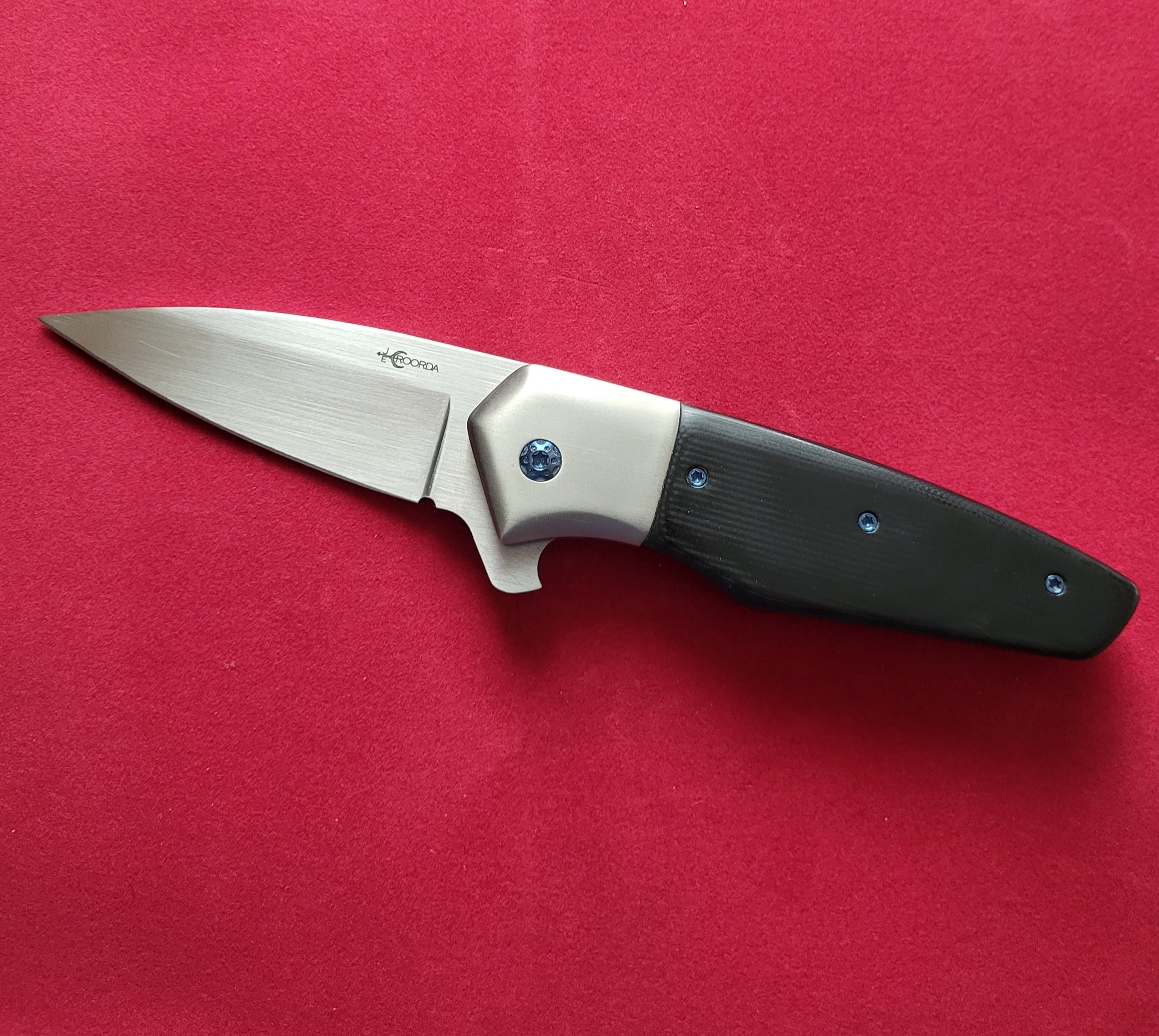 3 5/8" s30v satin finish flipper blade riding on caged bearings with .080 blue anodized Titanium liners with Zirc bolsters. All anodized Titanium fasteners. Comes with padded storage container.