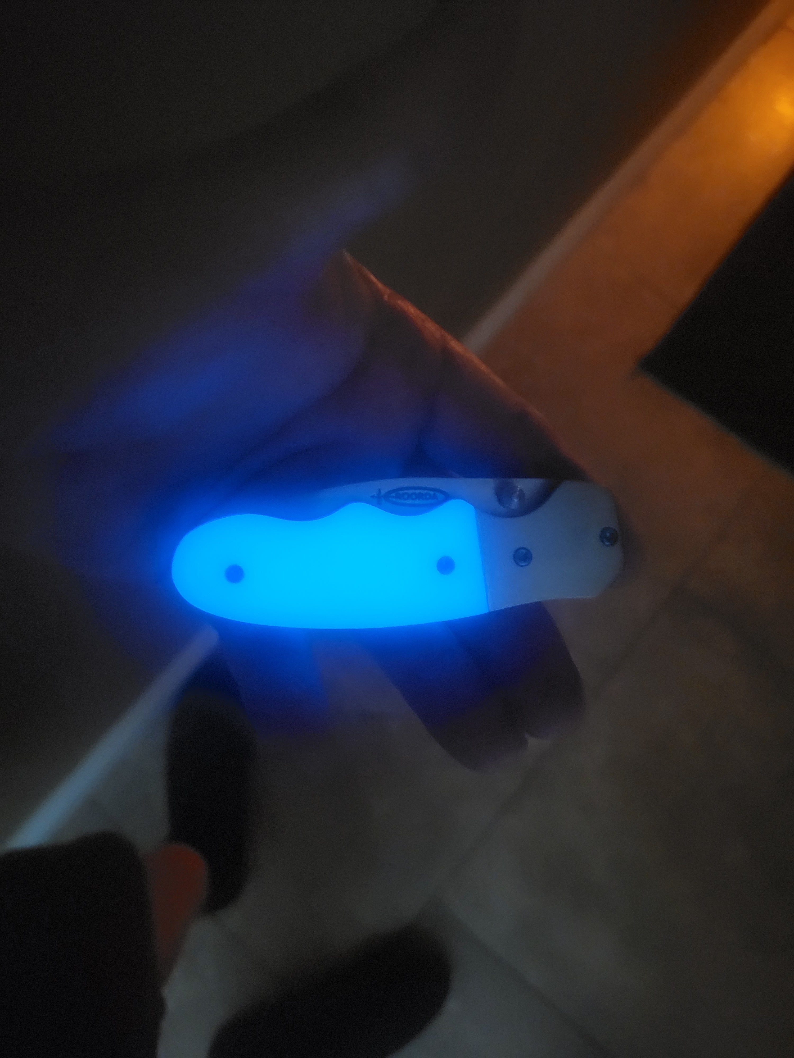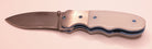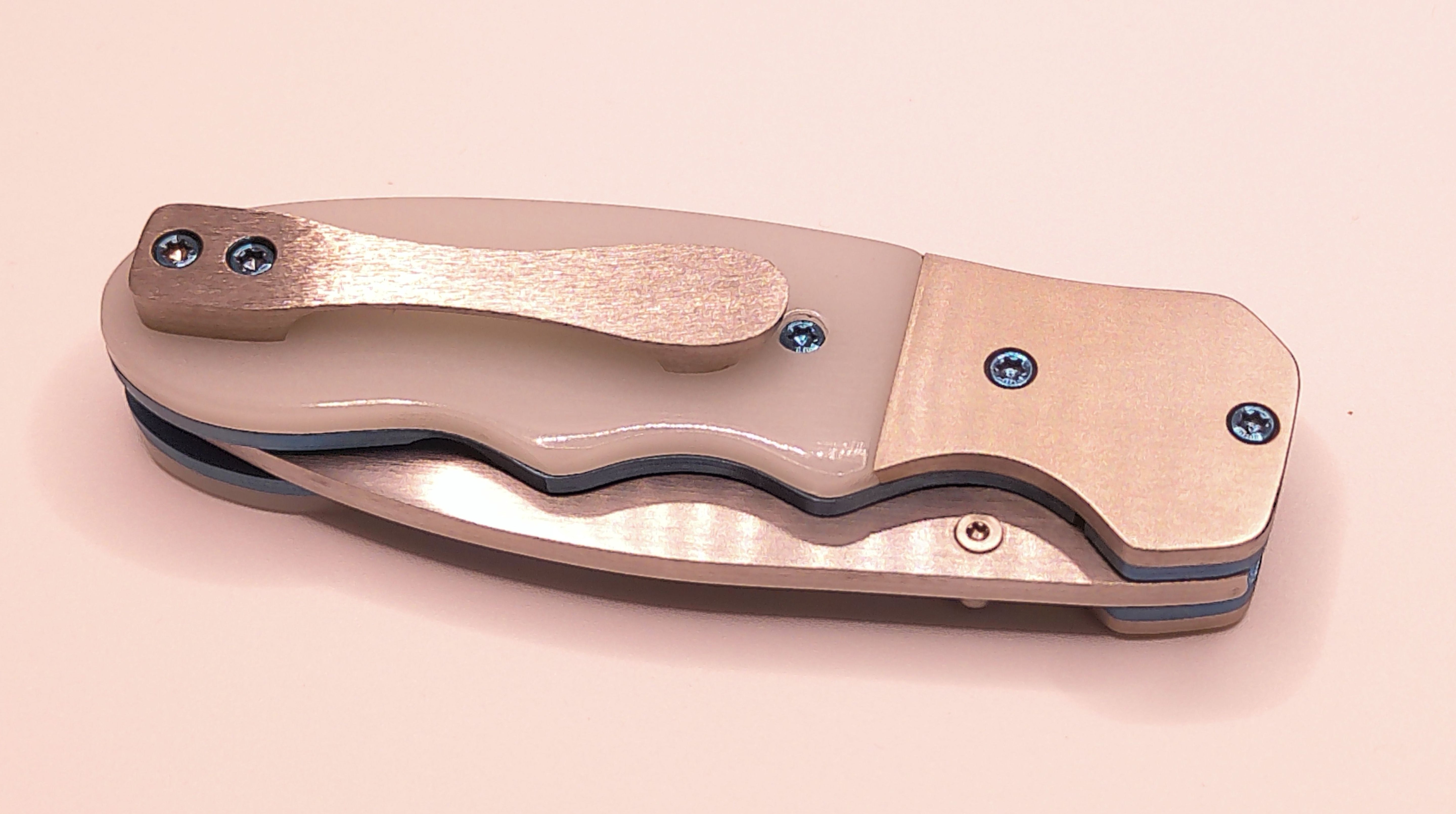 2 3/4" s30v hand rubbed satin finished recurved blade riding on caged bearings with Titanium liners and fasteners. blue glow in the dark scales. comes padded dry box