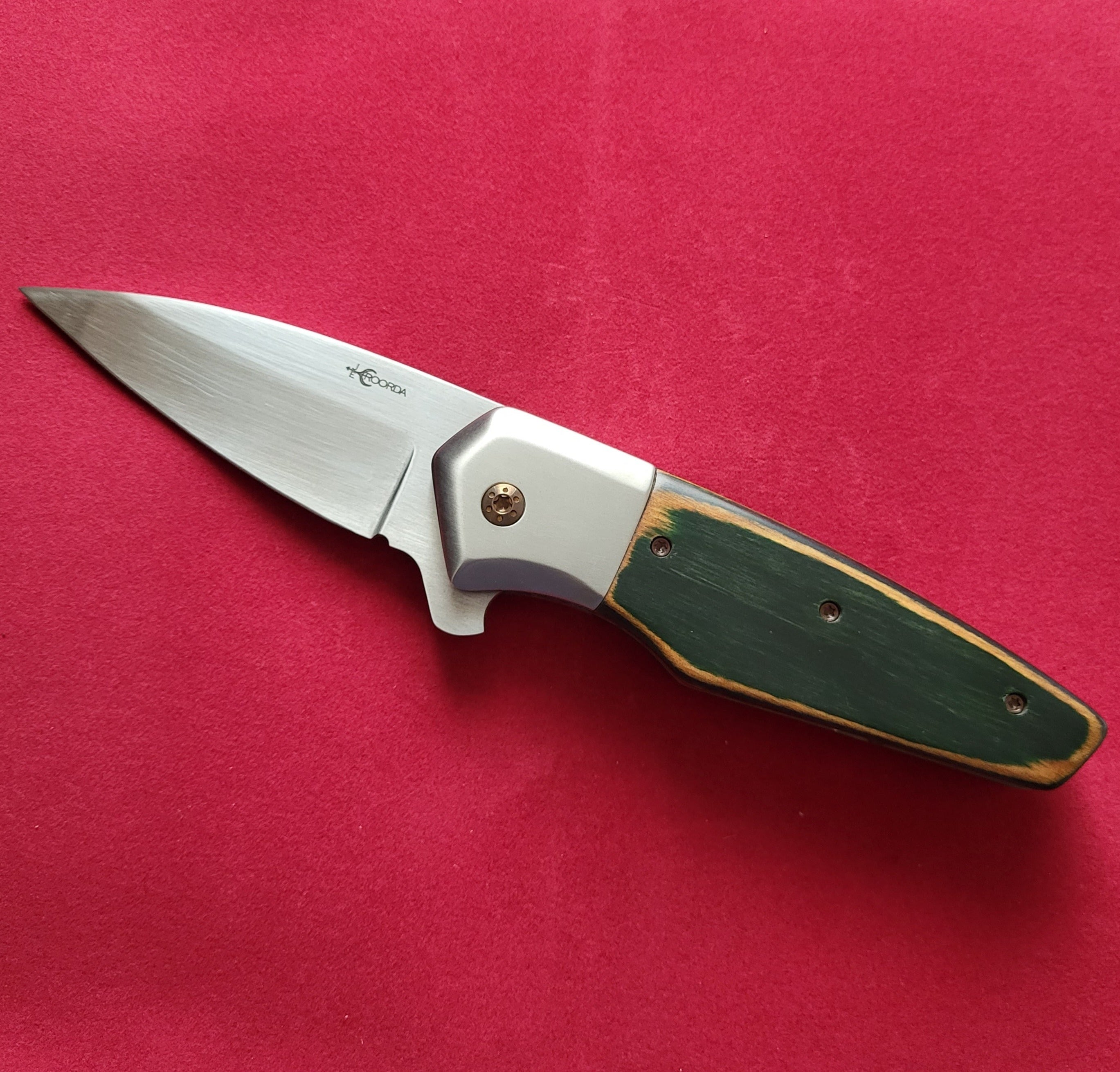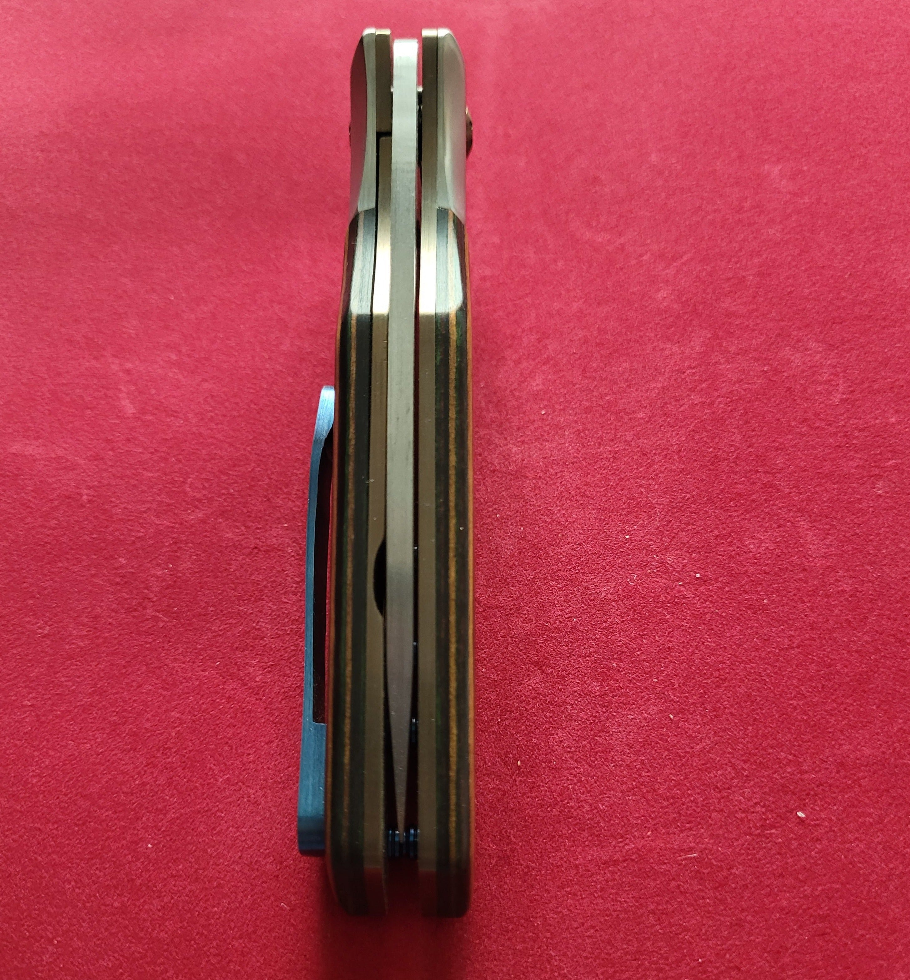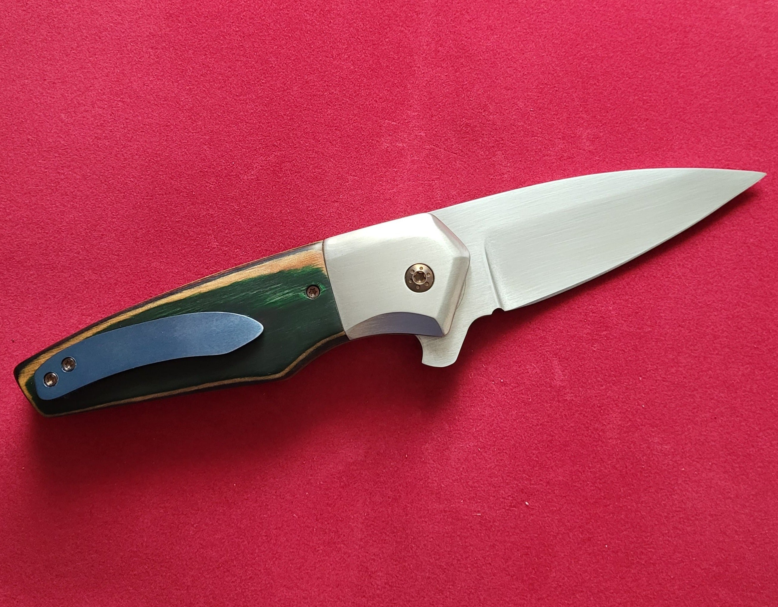 3 5/8" s30v satin finish flipper blade riding on caged bearings with .080 blue anodized titanium liners with Zirc bolsters and multi-color layered stabilized wood scales. All anodized Titanium fasteners. Comes with padded storage box