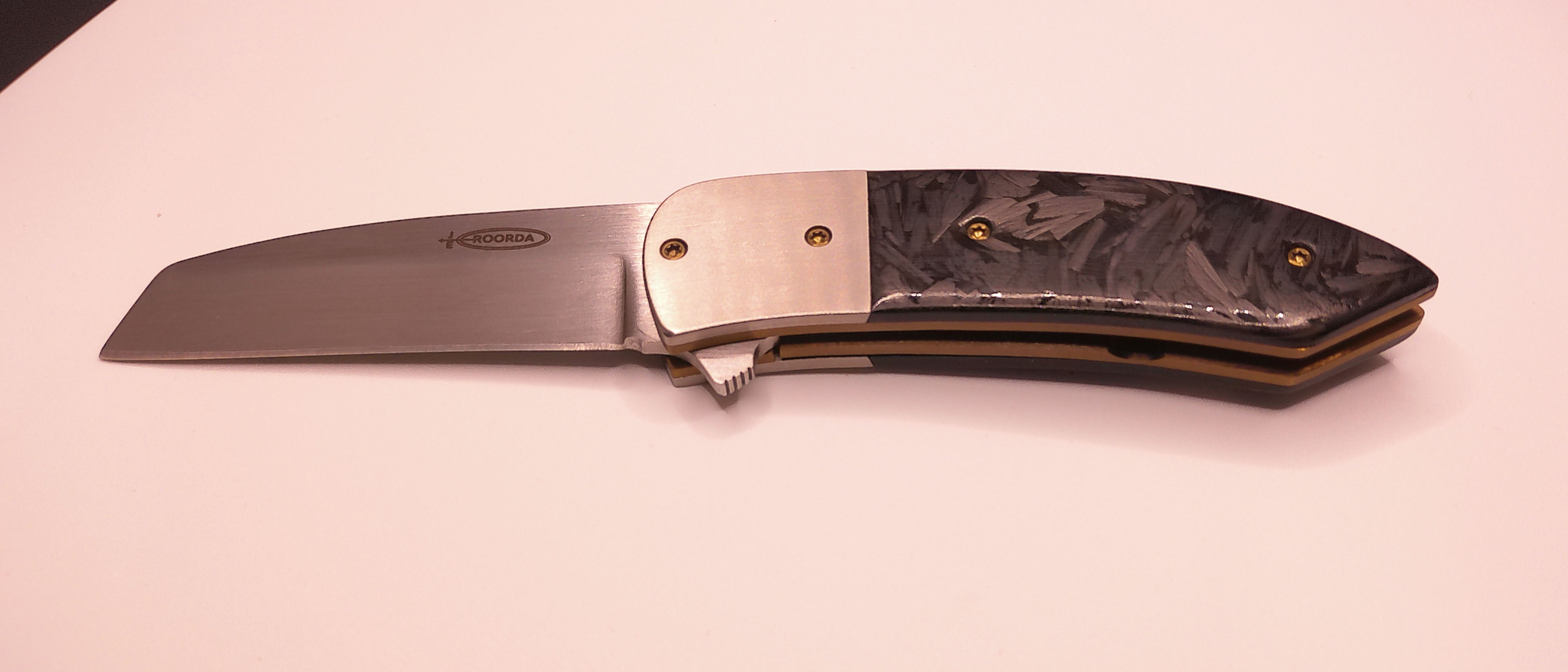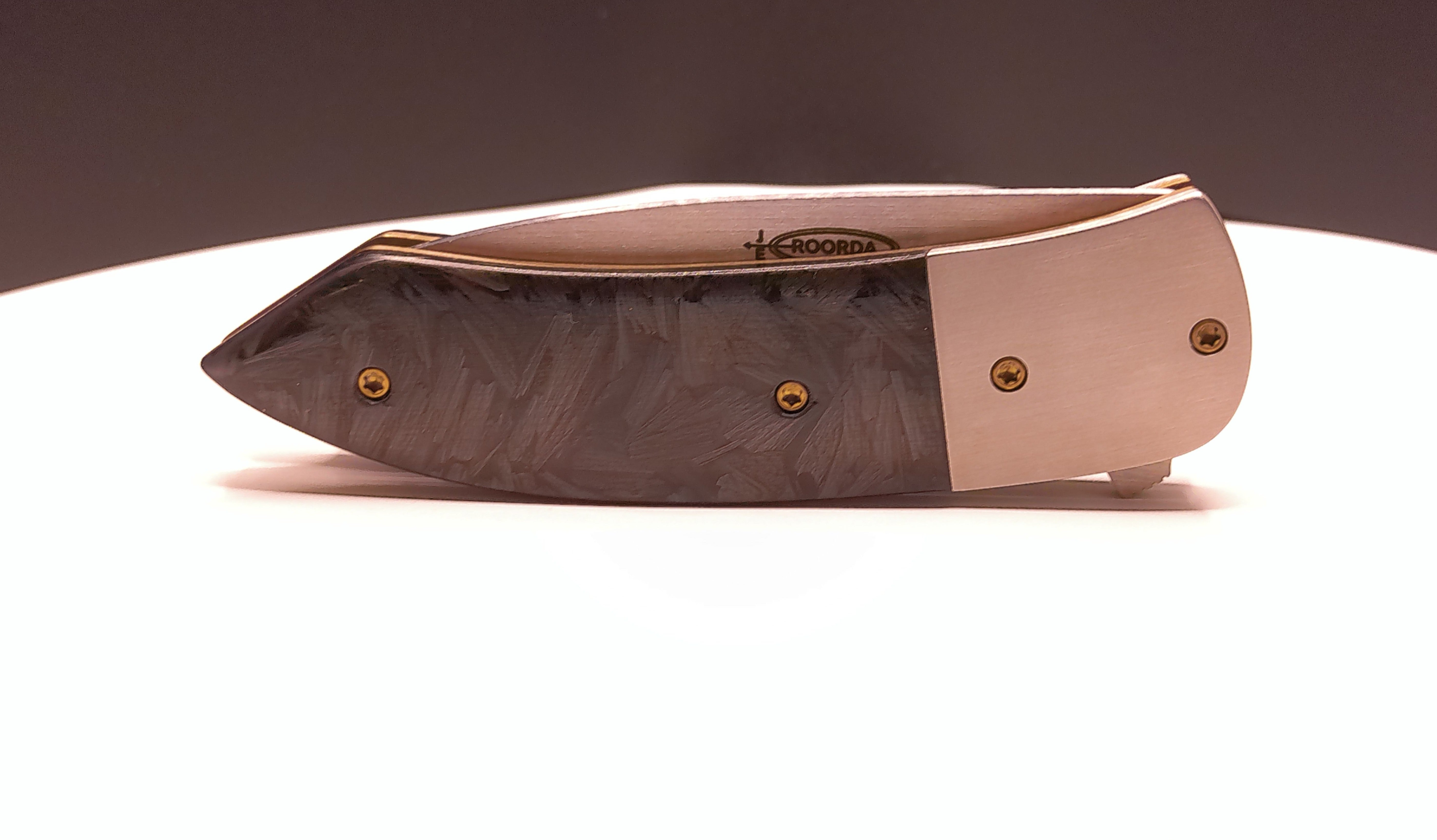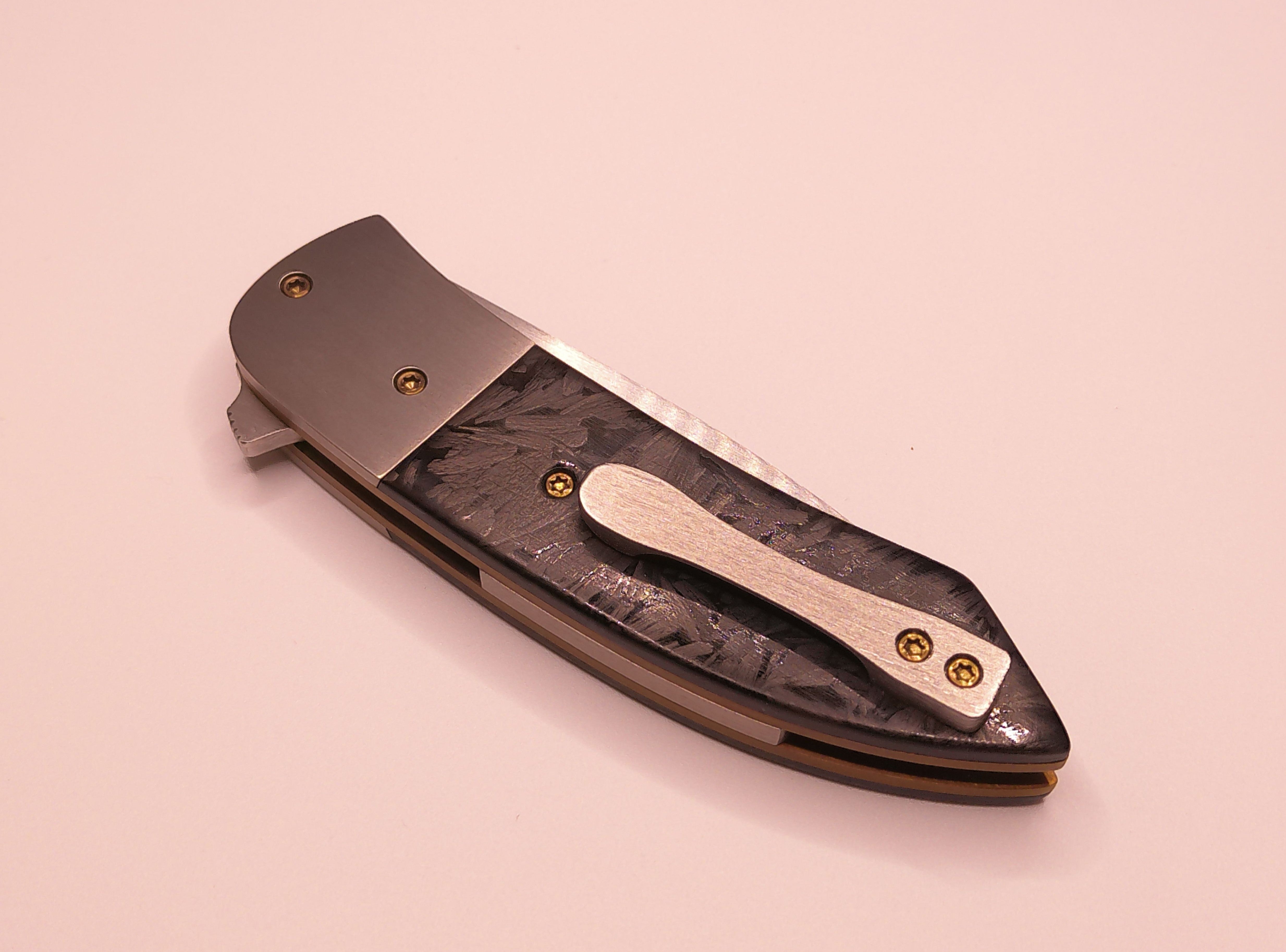 3 1/4" s30v hand rubbed satin finished blade riding on caged bearings with .080 Titanium liners and fasteners. shredded carbon fiber scales. comes with padded dry box